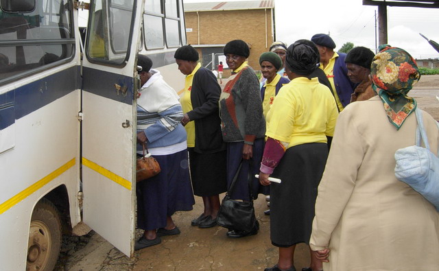 On Monday the gogos were decked out in the yellow T-shirts donated to them when they had their ball games in June, their red looped ribbons pinned on, long white candles in one hand, umbrellas in the other. At 10 am they were waiting for the bus to take them to the World AIDS Day rally due to start at 10:30. We waited and waited. “T.I.A.” as they say here – this is Africa.I made use of the time by whipping out my journal and interviewing 80 year old Emma Skosana, listening to her stories of losing all three of her children, and raising an adopted daughter. She ended up in Sabie in 1970 when the (apartheid) government took their house away and “made a coloured location there. Bantus were sent away”. Coloured refers to (East) Indians and mixed race, Bantu are black.
