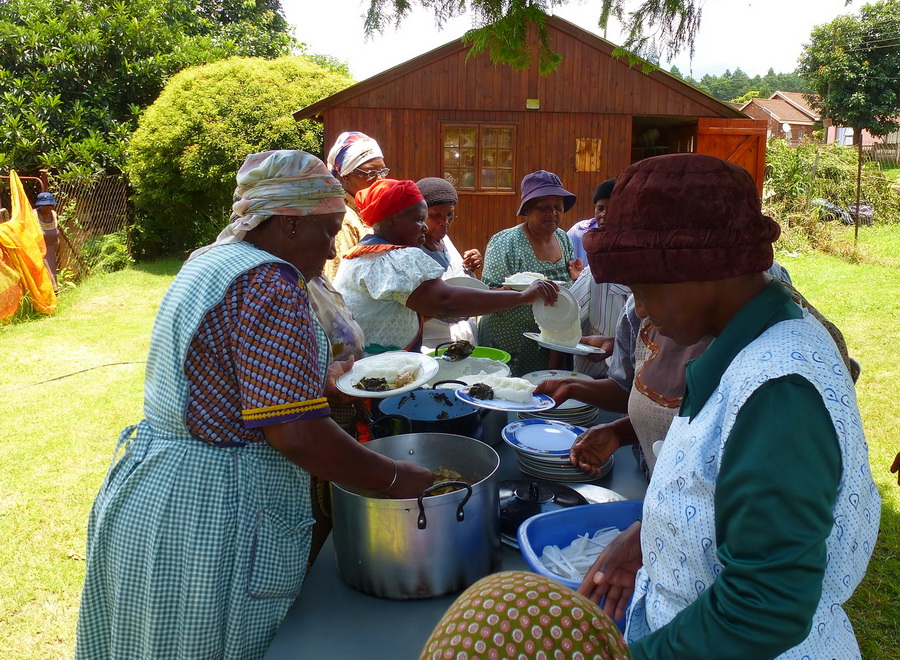 Our immensely capable volunteer administrators, Vicky and Myriam, were busy supervising the preparation of large vats of soup (for later distribution on the back streets) and a hot meal of chicken stew and mealie pap for the gogos. Myriam was also counselling one gogo who takes a vat of soup back to her township of Harmony Hill to distribute from her house to hungry children. But word has spread, and young men from surrounding communities are also demanding not only soup, but that she find them jobs. Seems there’s no end of problem solving to be handled.