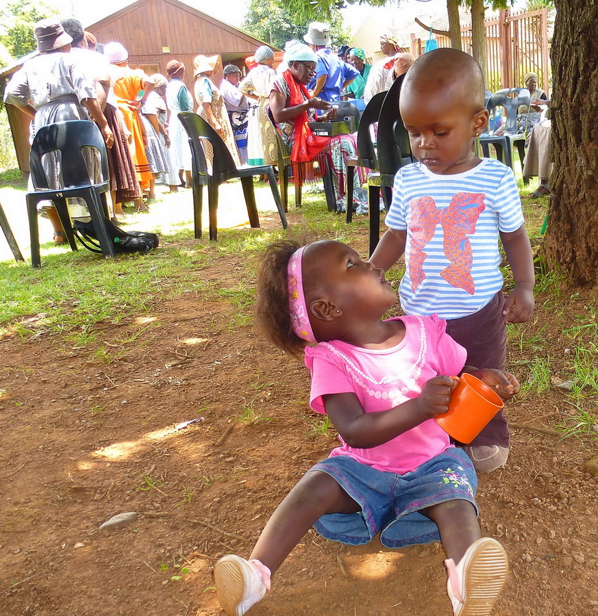 At the Sitabogogo project in the township of Simile the gogos were sitting in plastic chairs under the shade of the big tree. As I went around the circle greeting each individually with “Sawubona” and the African handshake (and several who wanted hugs), it was moving to recognize old friends I remembered by name, and heartening to meet several who were new to the program. Many were leisurely working on various handicraft projects – knitting, crocheting, and some very intricate and colourful beadwork. Others chatted with friends and explained apologetically that their eyes or trembling hands could no longer do this work. In a future blog we’ll see more detail of their handiwork.