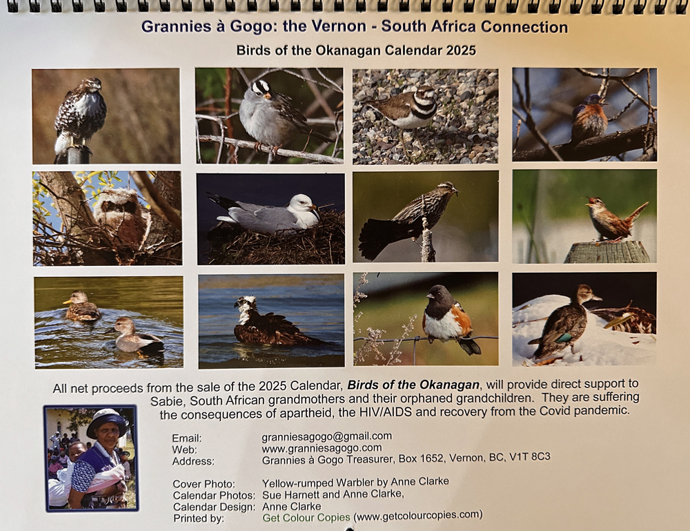 2025 Calendar – Beautiful photos of local birds in their habitat. The calendar is printed on high quality stock, each photo measuring 8″ x 10″, with every month featuring plenty of room to note the events of each day. The calendar, with a centre coil, measures 17″ x 11″ when opened and is an easy-to-mail gift. Order online and have it delivered to the recipient or we can arrange for pick up in Vernon. You can also order by emailing granniesagogo@gmail.com.