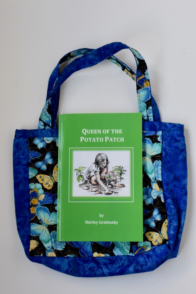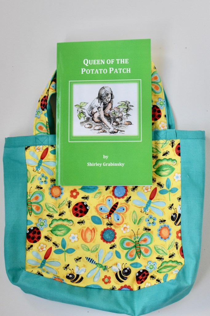 Now that you have Shirley’s amazing book Queen of the Potato Patch, you deserve to have this fabulous book bag to keep it in. Made from bright, fun, colourful fabrics these bags are perfect for all your book travel needs.