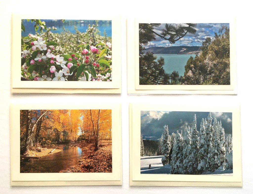From the Okanagan to Africa you have 6 sets of cards to choose from. Each set consists of 4 curated photos printed on quality card stock. The ‘Surprise’ set includes 2 bonus cards. With envelopes they measure 5.25x 7.25 inches (13.5 x 18.5 cm). The inside is blank.
